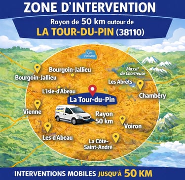 Clé Pro Auto, serrurier automobile mobile basé à La Tour-du-Pin (38110), intervient exclusivement dans un rayon de 50 km maximum autour de La Tour-du-Pin.